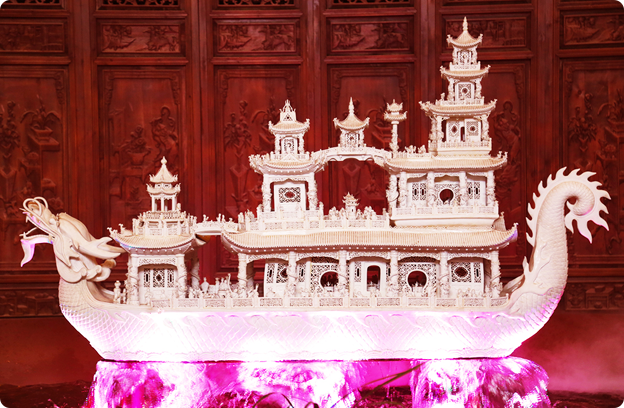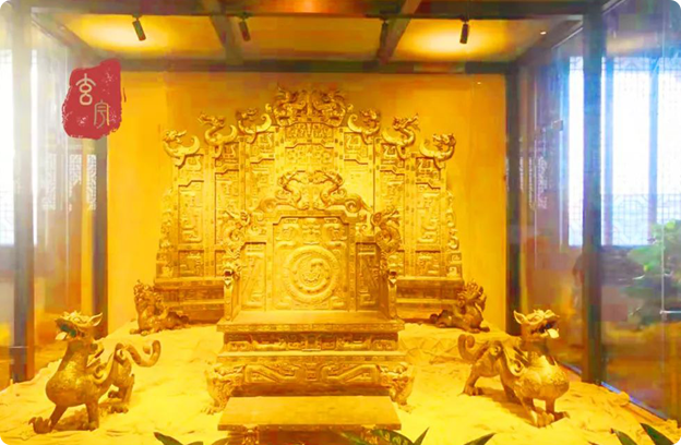 精彩纷呈的馆藏珍品 在众多藏品中,以瓷龙船、金镶玉为主的各式精美展品,是玄宇园内各个博物馆中博采众长,兼容并蓄的代表作。他们以素胚勾勒、金玉辉煌亦或是古朴典雅的特质深深吸引着人们的目光。 金镶玉 金镶玉是中国古代手工技艺集大成者,诞生于北宋年间,由于其工艺复杂、构思巧妙、造型精美丰富,同时继承了唐代以来中原金银器制作工艺,又兼具辽、金等胡风特色,故一直深受帝王贵族的钟爱。位于金名殿大殿一楼的金镶玉宝座、屏风和瑞兽组合,采用沿袭千年的传统工艺是制作,是非常罕见的体量较大的珍贵藏品。 瓷龙船 瓷龙船由整体船身和多层楼阁组成,其中56根龙柱代表中华56个民族,中间穿插天桥、船锚、铁链、船帆,一应俱全,做工复杂而精细、人物构造逼真,令人叹为观止。《群仙祝寿》人物由十八罗汉、福禄寿三星、四大天王、七仙女、玉帝将相、士兵、随从等一百多人组成,形态各异、生动逼真,或喜或乐、或歌或舞,可谓是一个浓缩了的乾坤世界、欢乐境地。