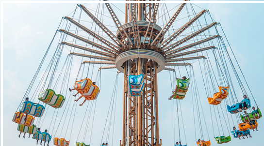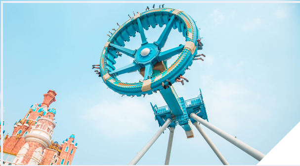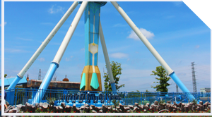 飞行塔类游艺机。该游艺机中间滑行架伸出 21个悬臂,各带动一个双人座椅绕竖直中心立柱旋转,同时滑动架又带动悬臂和座椅沿竖直中心立柱做升降运动。乘客将被提升到约 46 米的高度,以 50km/h 速度绕中心立柱飞行,既刺激又适合观光。