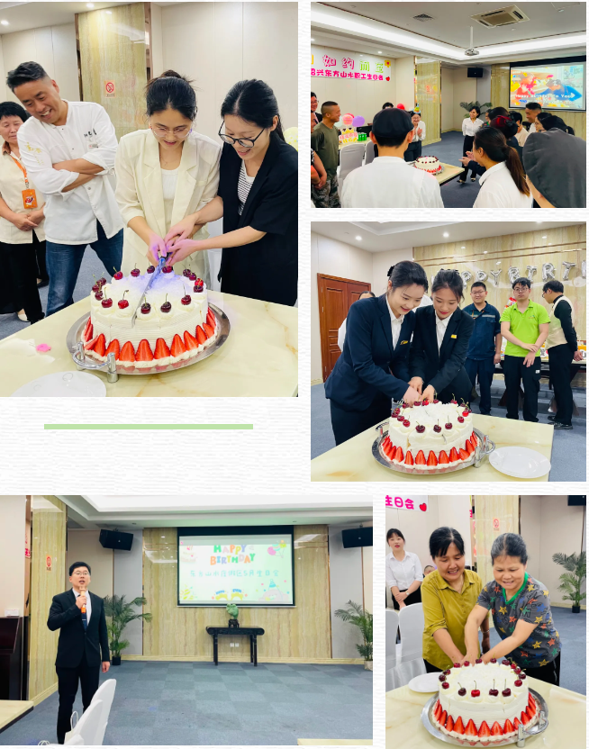 活动当天,会议室被布置得温馨而活泼,五彩气球与绚烂的彩带交织,营造出浓厚的生日氛围,一份份精致的生日礼物,一张张用心的贺卡,一块块美味的生日蛋糕,每一处细节都透露出公司对员工的关怀与祝福。同时,酒店总经理丛总亲临现场为5月寿星送上祝福!