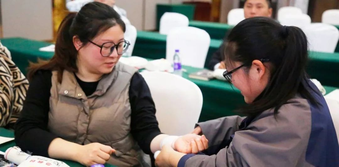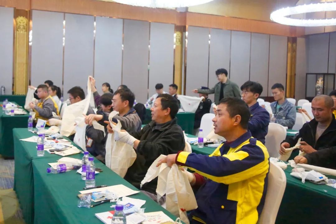 在课堂上,培训老师耐心讲述了救护的基本背景,强调了“黄金四分钟”的重要性,并教授了应急救护知识,包括心肺复苏术、三角巾包扎、绷带包扎的规范操作和除颤仪(AED)的使用方法。职工们认真听讲,用心记录,学习氛围积极活跃。