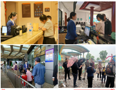 在各售票窗口、收银点、检票口都忙碌着她们的身影,为钱款安全及游客快速补差价入园做好保障。