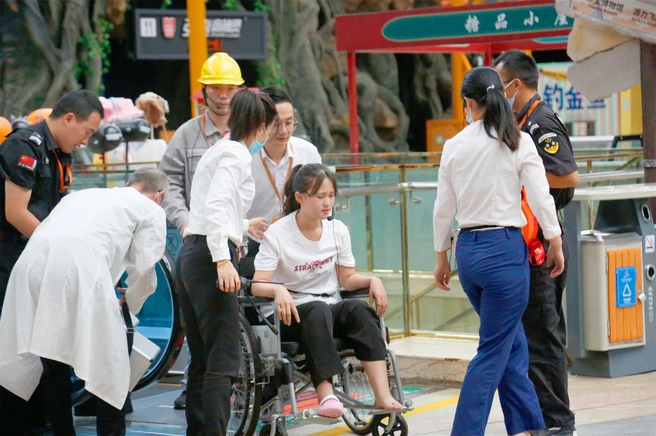 本次演练模拟一名乘客穿洞洞鞋自上而下乘坐自动扶梯,在出口处鞋子卡在扶梯梳齿板内摔倒,导致脚部受伤。现场乐园安保部人员第一时间发现,迅速前往,按下扶梯红色紧急停止按钮,安抚受伤乘客情绪,并向设备部求助,设备部向乐园领导报告,启动应急救援程序,通知安保部、设备部、安督办及电梯维保人员进行现场救援。安保人员到场维持现场秩序,安督办对受伤人员进行简单包扎救治,并送外就医,设备部人员对现场进行围挡,查看事故原因,并配合电梯维保人员到场施救,打开转向站仔细查看设备状况,对梳齿板进行拆卸检查,消除故障,同时更换配件、调试运行,后经绍兴市特种设备检测院检查,确保无异常情况后,电梯重新运行。