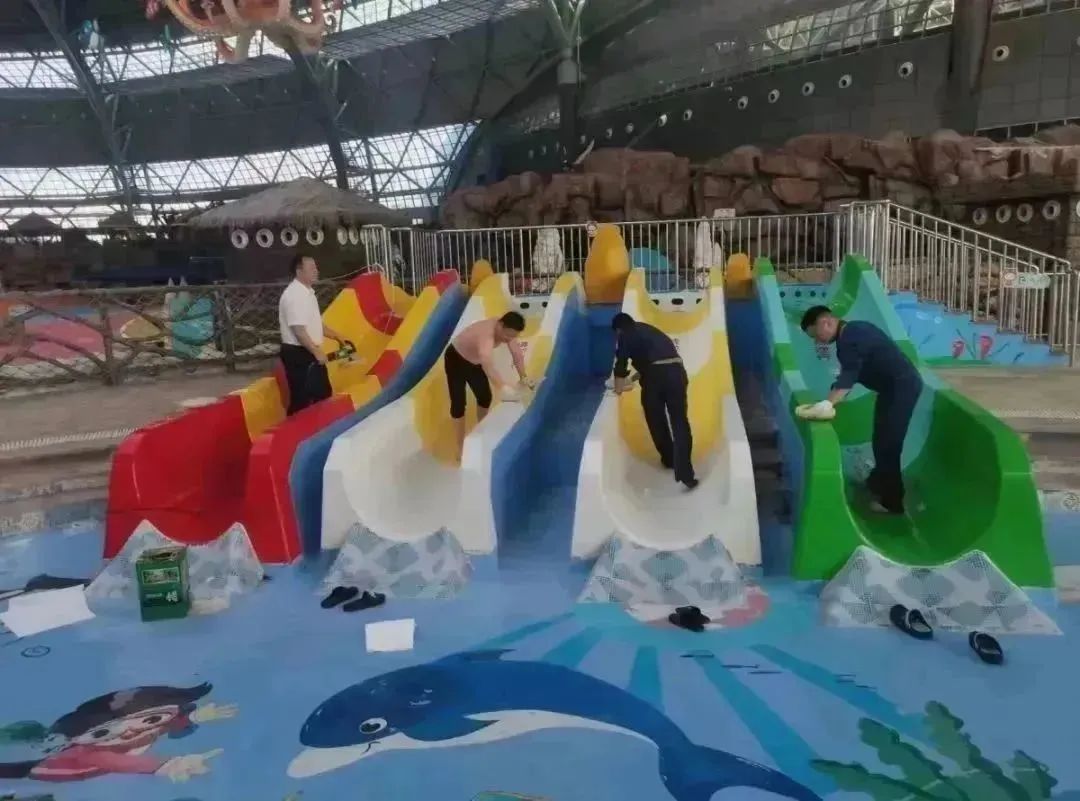 水公园班组按照休园整改计划,对该区域设备开展全面整改与维护保养工作。截止本周,已完成大小儿童池和水寨滑道整改保养工作。