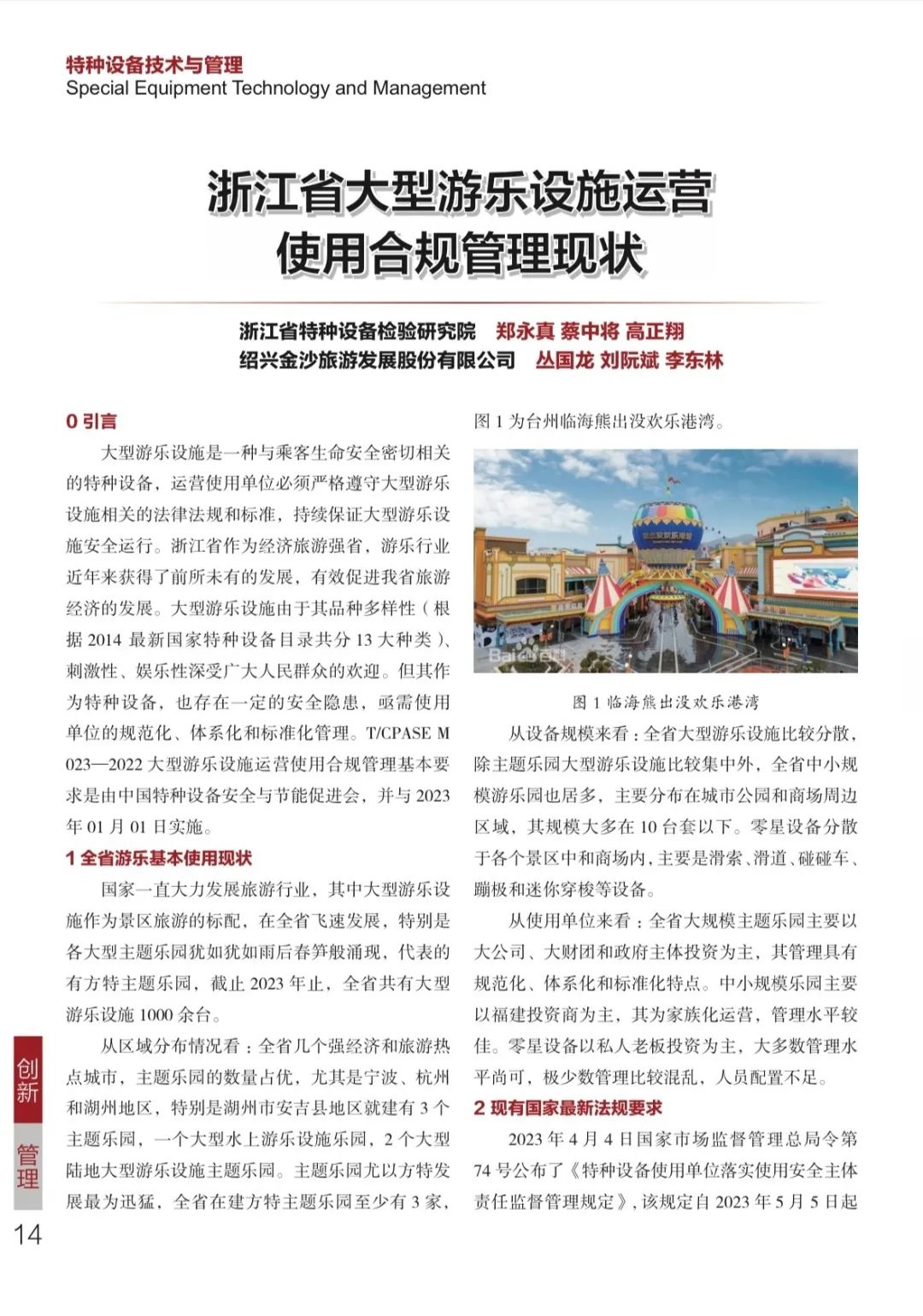 近日,由省特检院专家郑永真、蔡中将、高正翔及我司相关负责人联合编写的“浙江省大型游乐设施运营使用合规管理现状”在浙江省特种设备检测研究院主办的期刊《浙江特检》第 61 期发表,本文牢牢聚焦关键论题,对全省游乐设施运营使用合规使用现状展开了深入透彻、广泛全面且条理系统的论述。我司长期以来始终将大型游乐设施的运营使用合规管理工作置于重中之重的位置,构建有完备的管理制度与流程。从设施的前期规划、选型采购,到中期的安装调试、日常运维,再到后期的报废更新,每个环节都有明确的规范和标准。正是凭借这种严谨缜密、科学合理、规范有序的管理模式,我司才得以在行业内崭露头角,进而被当作行业标杆刊载于该期刊之上。