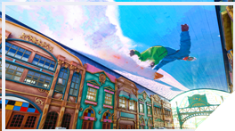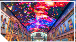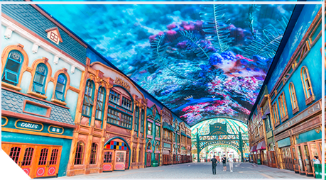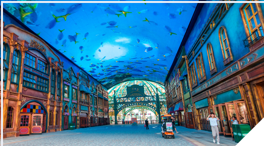荟萃各式餐饮商品、顶部为一整块环绕的天幕,场景逼真宏伟,令游客流连忘返、身心尽娱的时尚消费目的地。