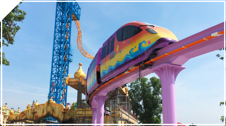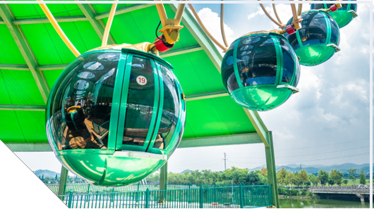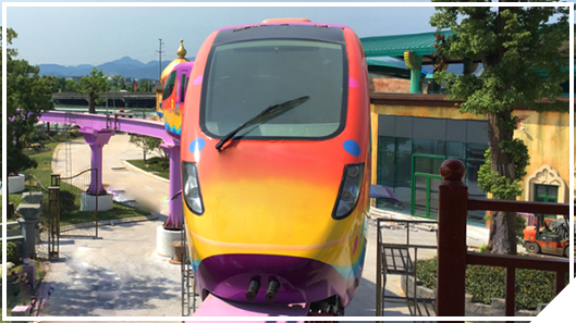 架空游览单轨观光车,连通东方山水乐园一期、二期。由专人驾驶,可同时乘坐52名乘客,运行时间约10分钟。游客在舒缓悠闲中尽揽园区美景,又可快速抵达目的地。