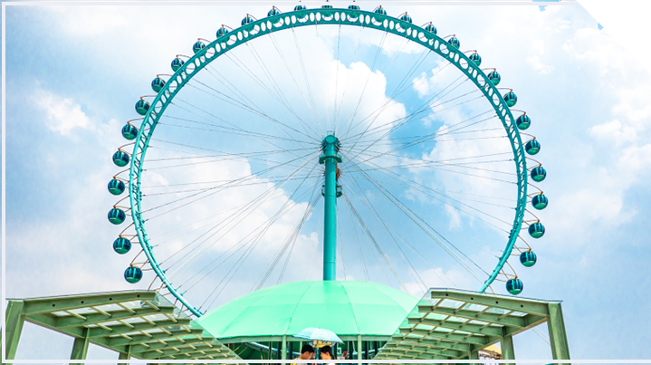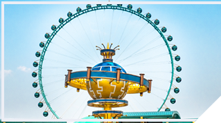 建设总高度达88米,挂有42个太空舱。从远处看像是五彩缤纷的巨大风车在缓缓转动,又似一颗颗晶莹的珍珠镶嵌于大转盘之上。每当夜幕降临,大转盘上华灯齐放、流光溢彩,使人如入梦幻之境,更增添这个庞然大物的高大伟岸,又极具妩媚可爱的无穷魅力。