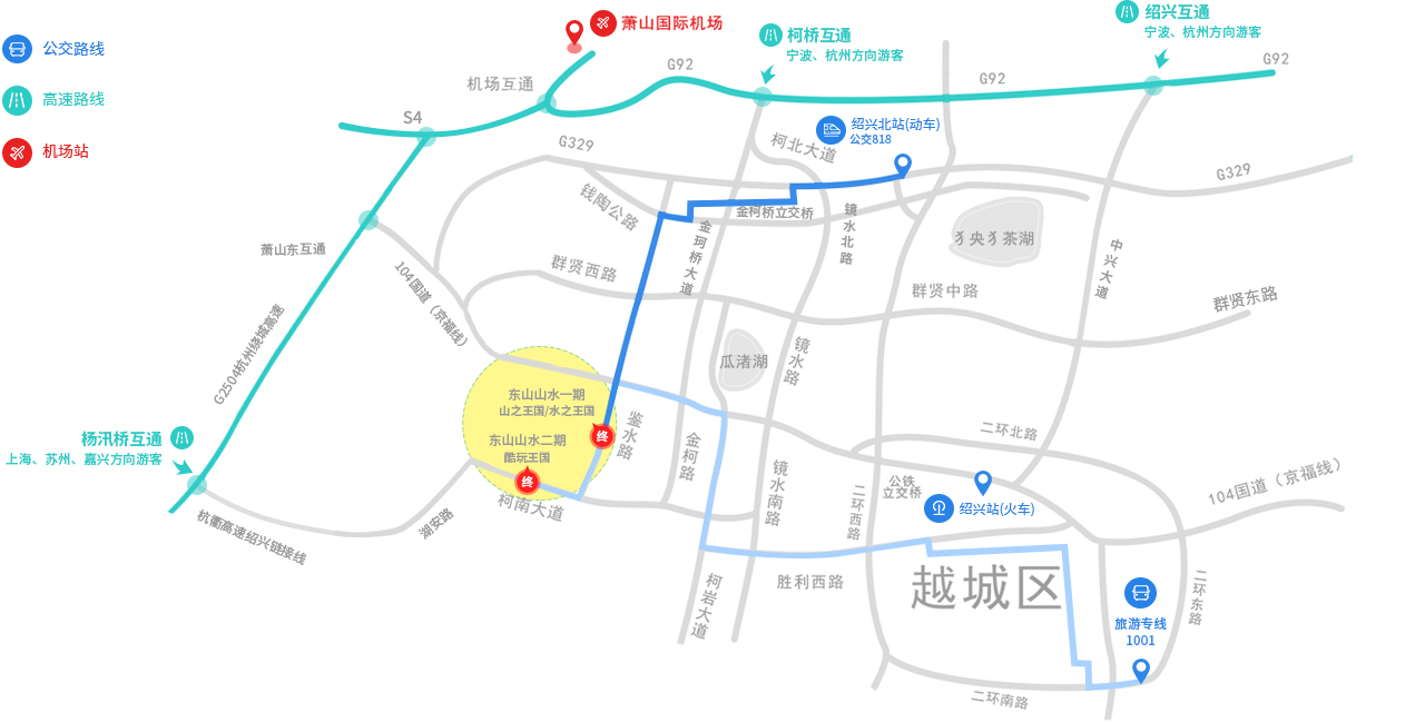 绍兴市越城区(以客运中心为起点),乘坐快速公交1号线,至港越路口下车;转816路车,至独山嘉园下车;转818路车,至东方山水站下车。